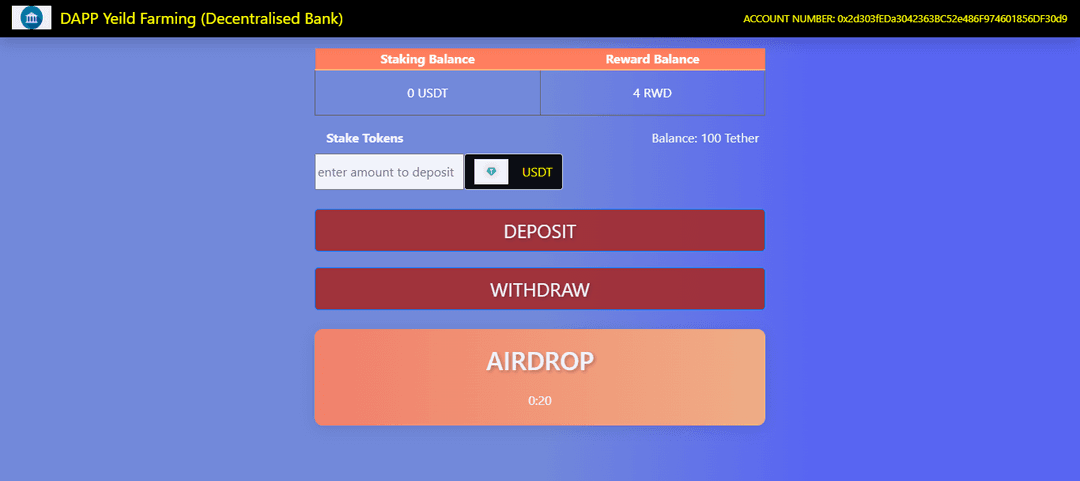 Created a Defi-Staking app using blockchain technology that rewards propotional to the time and amount.
